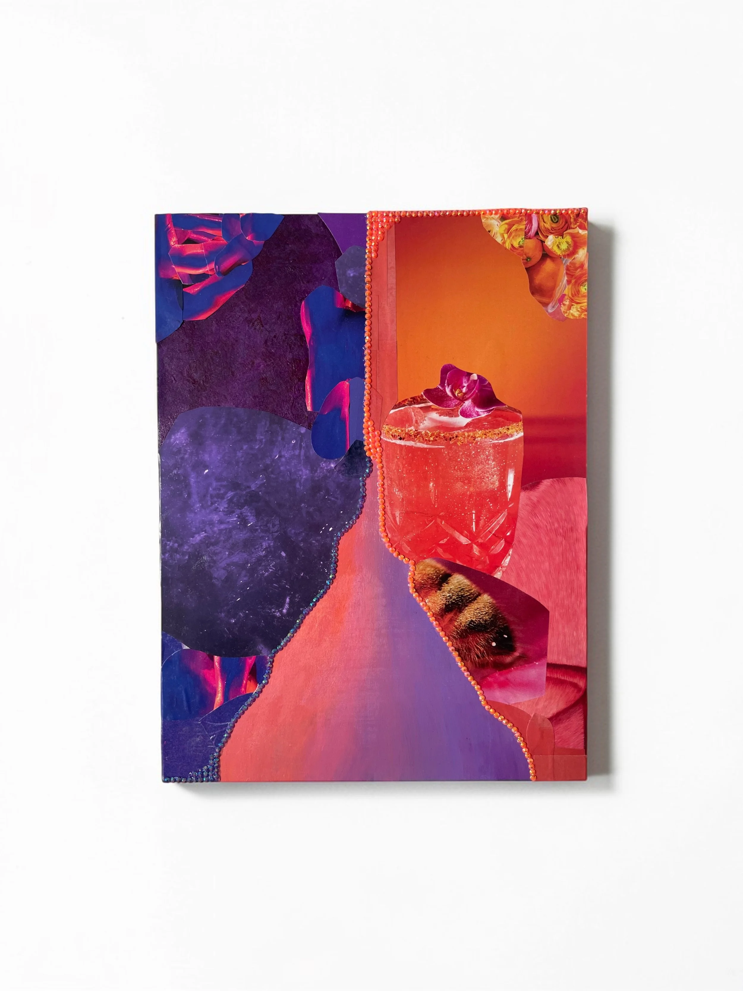 acrylic, magazine snippets, collage paper, and gems on wood panel, 12 × 9 inches